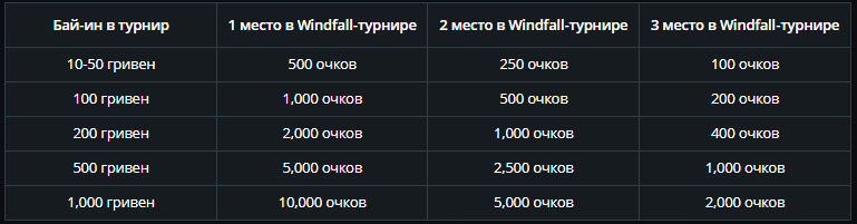 За каждую гривну рейка начисляется 10 очков (+1 очко за каждую раздачу Холдеме и Омахе). В Windfall очки начисляются в зависимости от играемого лимита и занятого места.
