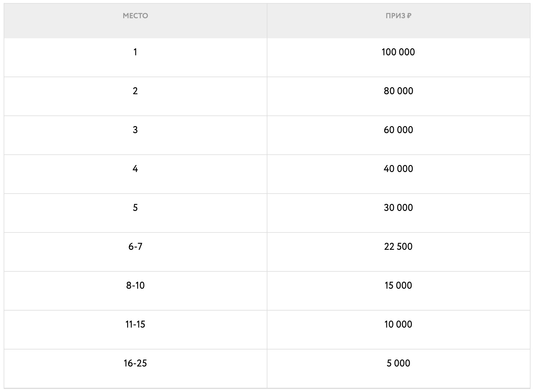 С 1 по 20 мест — $50 GB С 21 по 100 место — билет на фриролл |