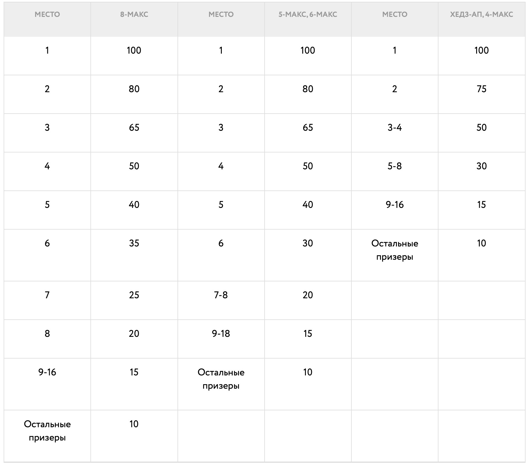 Информацию обо всех лидербордах собрали в одну таблицу. Подробности распределения призов ищите в клиенте во вкладке с нужной дисциплиной.