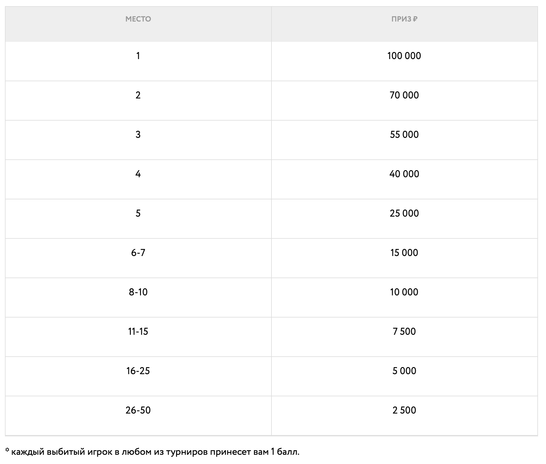 | Spin&Gold | $10K | Очки начисляются в зависимости от занятого в турнире места и размера бай-ина.** |