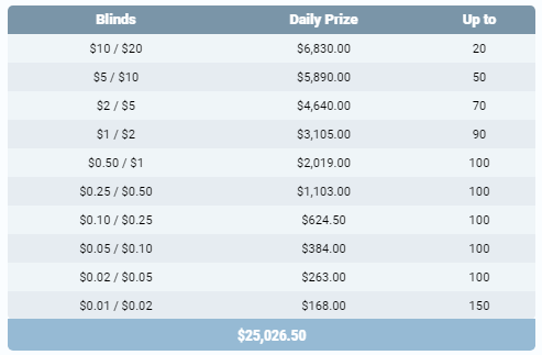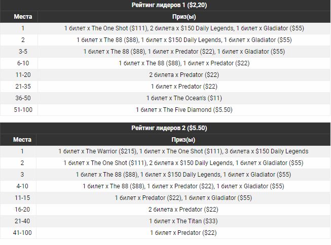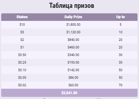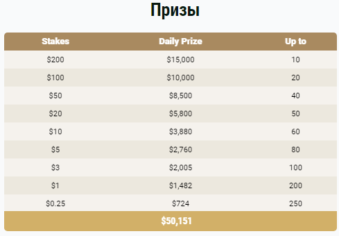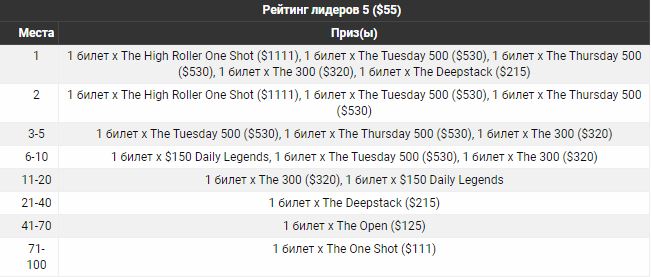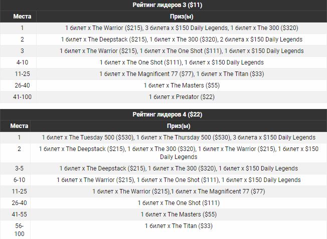 Лидерборд разделен на 4 позиции в зависимости от размера бай-ина. Каждый день с 11:00 до 12:59 МСК «happy hour»: очки умножаются на х1,5. Призы выплачиваются турнирными долларами.