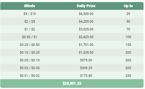 Очки начисляются по количеству сыгранных рейковых раздач. Каждый день с 11:00 до 12:59 МСК «happy hour»: очки умножаются на х1,5. Призы выплачиваются кеш-долларами, которые можно использовать только для кеш-игры.