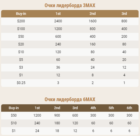Важно! В турнирах 6-макс количество очков увеличивается на х1,5.