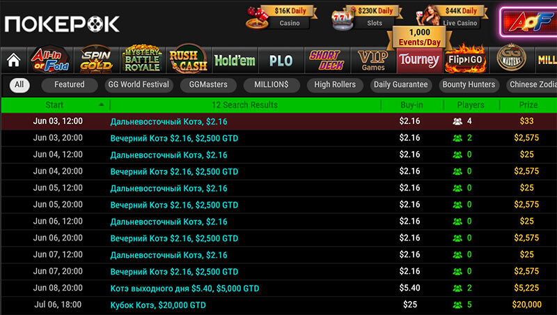 - $5.40 Котэ выходного дня $5К Gtd — по субботам в 20:00 МСК. Билет на Кубок Котэ для топ-9.