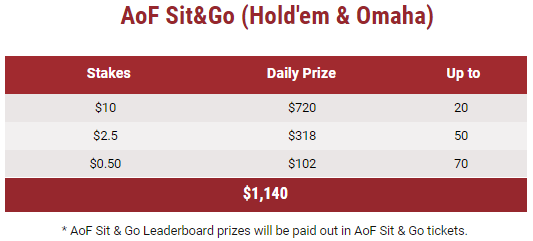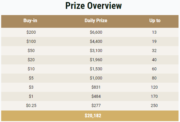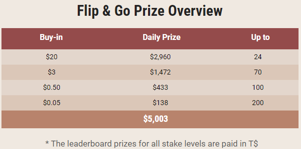 Лидерборд разделен на 4 позиции в зависимости от размера бай-ина. Каждый день с 09:00 до 11:59 МСК «happy hour»: очки умножаются на х1,5. Призы выплачиваются турнирными долларами.