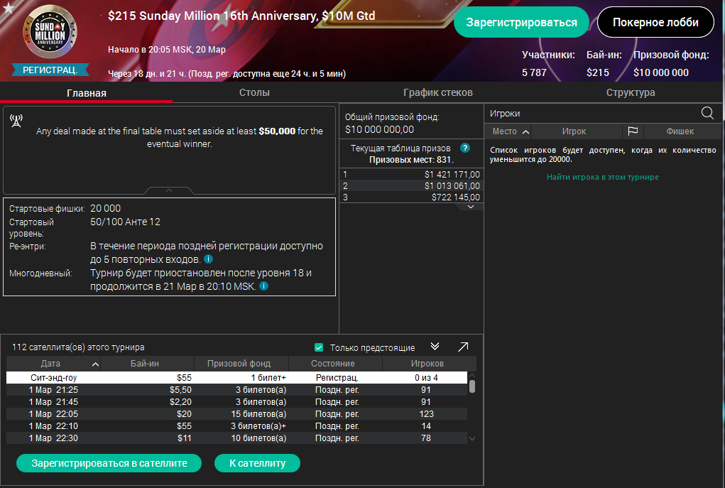 А 20 марта в 20:05 МСК стартует юбилейный Сандей Миллион с гарантией $10M. Можно попробовать отобраться с фрироллов.