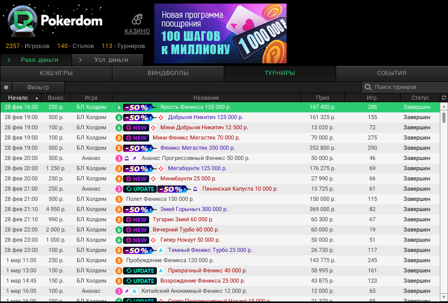 С 12 февраля на Покердоме стало на 14 турниров больше. Часть из них — это мини-версии уже имеющихся турниров, например: