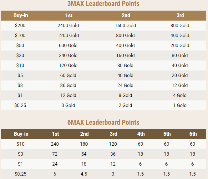 Лидерборд поделен на 9 позиций в соответствии с бай-инами (6-макс и 3-макс турниры участвуют в одном и том же зачёте). Очки начисляются в зависимости от занятого в турнире места и размера бай-ина. Каждый день с 11:00 до 12:59 МСК «happy hour»: все очки умножаются на х1,5. Призы выплачиваются билетами Spin & Gold.