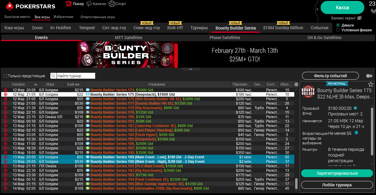 По 13 марта на PokerStars будет проходить серия турниров с нокаутами. В расписании Bounty Builder Series 196 турниров по NLHE, PLO, PLO8, 6+, HORSE и 8 игр с бай-инами от $11 до $1,050. Два Main Event стартуют 13 марта в 20:05 МСК: