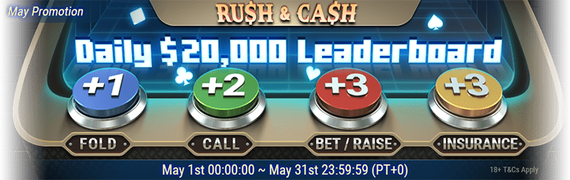Гонка среди игроков Rush&Cash увеличилась на $5.000 по сравнению с предыдущим месяцем. Гонка проходит на лимитах от NL2 до NL200. Правила остались те же. За каждое действие игрок получает очки: