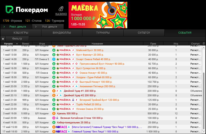 С 1 мая Покердом добавляет акционные турниры в формате буст. 10 человек разделят между собой приз в 50.000 рублей. Акционные события будут отмечены в лобби специальным значком «Маёвка».