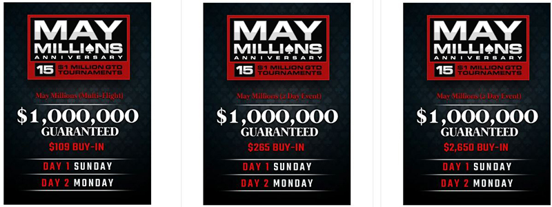 May Millions Anniversary — новая масштабная акция от PokerKing. Каждое воскресенье в руме будут проходить 3 турнира-миллионника Anniversary Millions с бай-инами $109, $265 и $2650. Турниры за $265 и $2650 двухдневные, Day 1 стартует в воскресенье в 22:00 МСК, Day 2 в понедельник в 22:00 МСК.