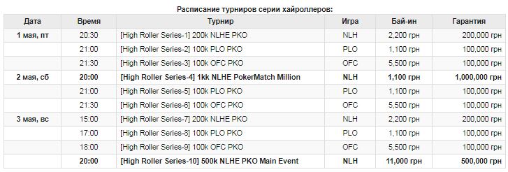 С 1 по 3 мая на PokerMatch пройдет High Roller Series с гарантией 2.500.000 грн. (около $93.000). В расписании 10 турниров по Холдему, Омахе и Ананасу с бай-инами от 1.100 грн. ($40) до 11.000 грн. ($400).