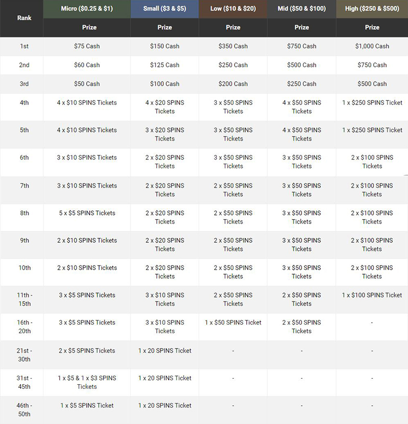 Не менее сочная ежедневная гонка для игроков SPINS. Гонка разделена на 5 лимитов. Очки начисляются по мудрёной формуле. Вот как распределяются призовые в гонке для игроков SPINS: