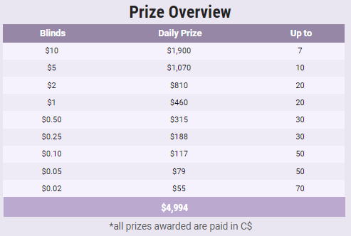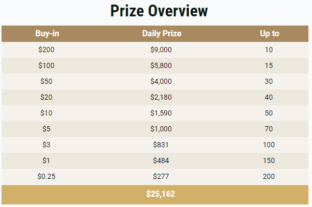 Лидерборд разделен на 4 позиции в зависимости от размера бай-ина. Каждый день с 09:00 до 11:59 МСК «happy hour»: очки умножаются на х1,5. Призы выплачиваются турнирными долларами.