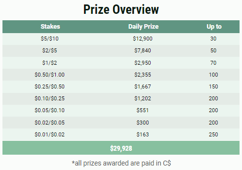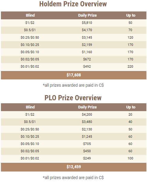Очки начисляются по количеству сыгранных рейковых раздач. Каждый день с 09:00 до 11:59 МСК «happy hour»: очки умножаются на х1,5. Призы выплачиваются кеш-долларами, которые можно использовать только для кеш-игры.