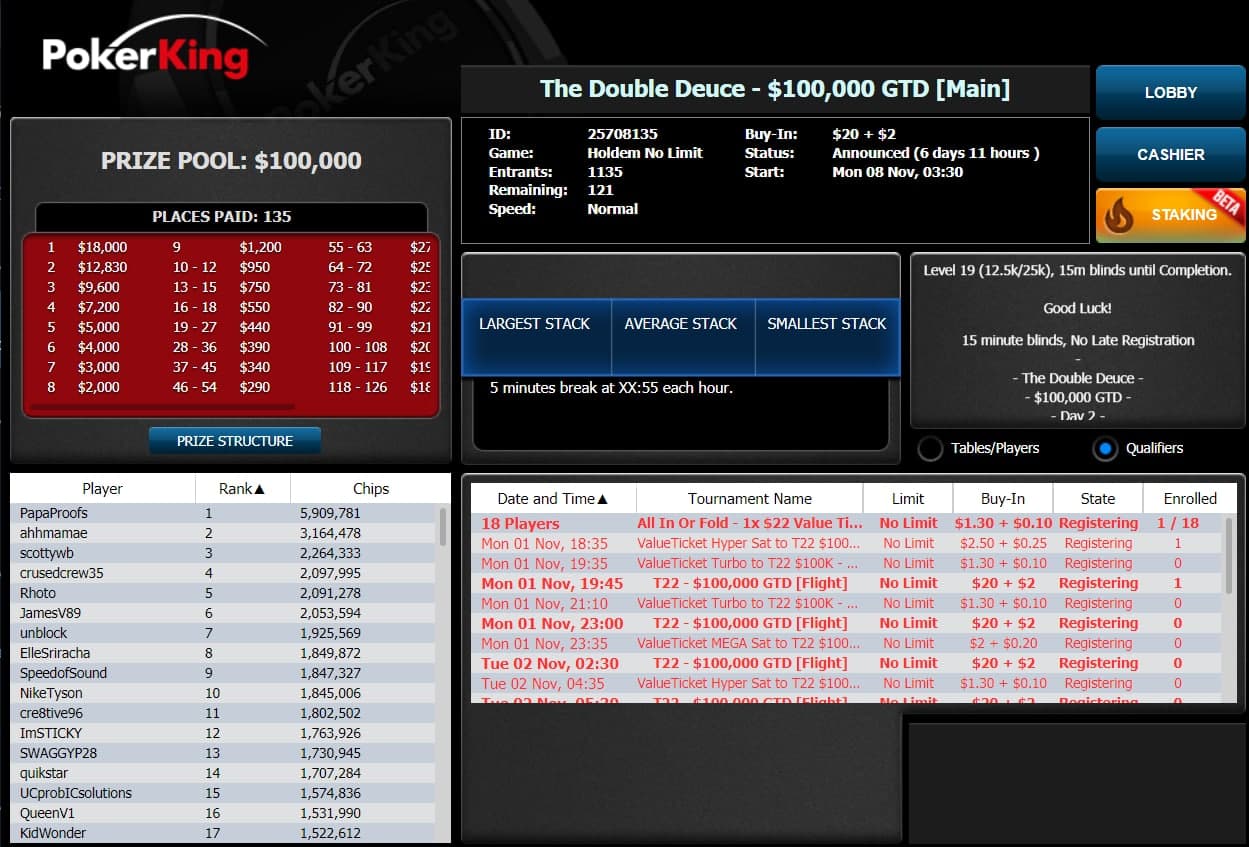 PokerKing: новый регулярный турнир $22 The Double Deuce $100K Gtd