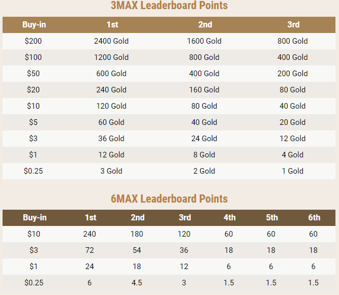 Лидерборд поделен на 9 позиций в соответствии с бай-инами (6-макс и 3-макс турниры участвуют в одном и том же зачёте). Очки начисляются в зависимости от занятого в турнире места и размера бай-ина. Каждый день с 11:00 до 12:59 МСК «happy hour»: все очки умножаются на х1,5. Призы выплачиваются билетами Spin & Gold.