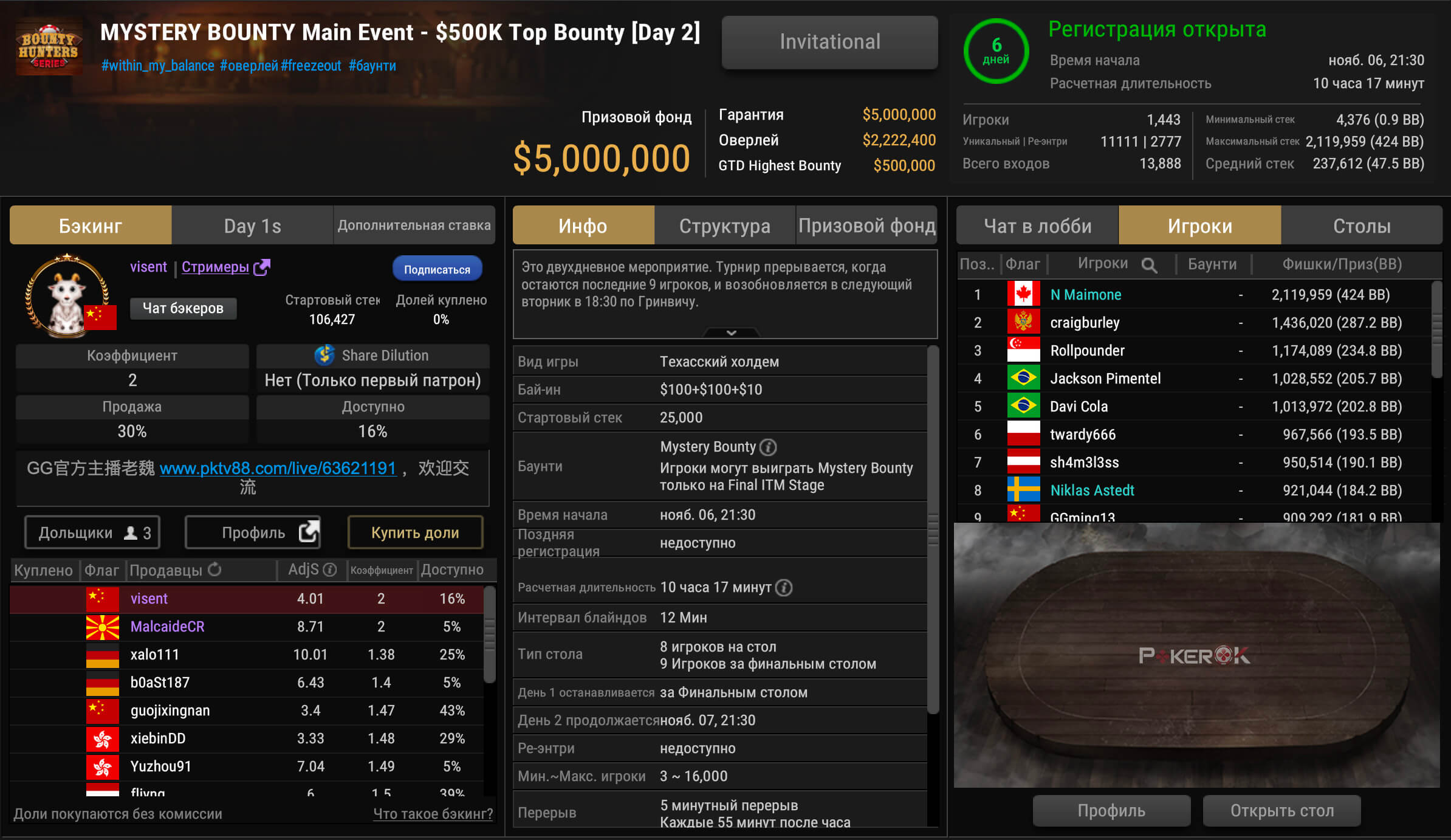 6 ноября в 21:30 МСК стартует Day 2 Главного события Bounty Hunters Series — до этого времени будут проходить Day 1 (можно сыграть несколько флайтов, стеки суммируются). Одному самому везучему игроку в этом турнире достанется баунти в размере $500K.