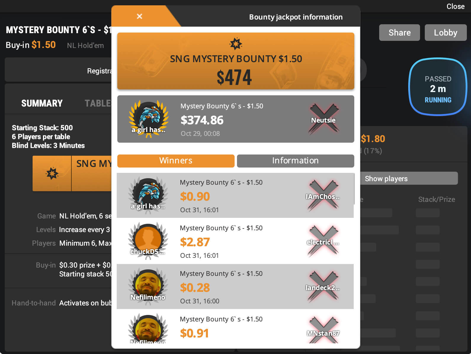Призы в кеш-гонках и Boost выплачиваются кеш-долларами, в Windfall и SNG — турнирными долларами. Подробности ищите в лобби во вкладке «My Missions».