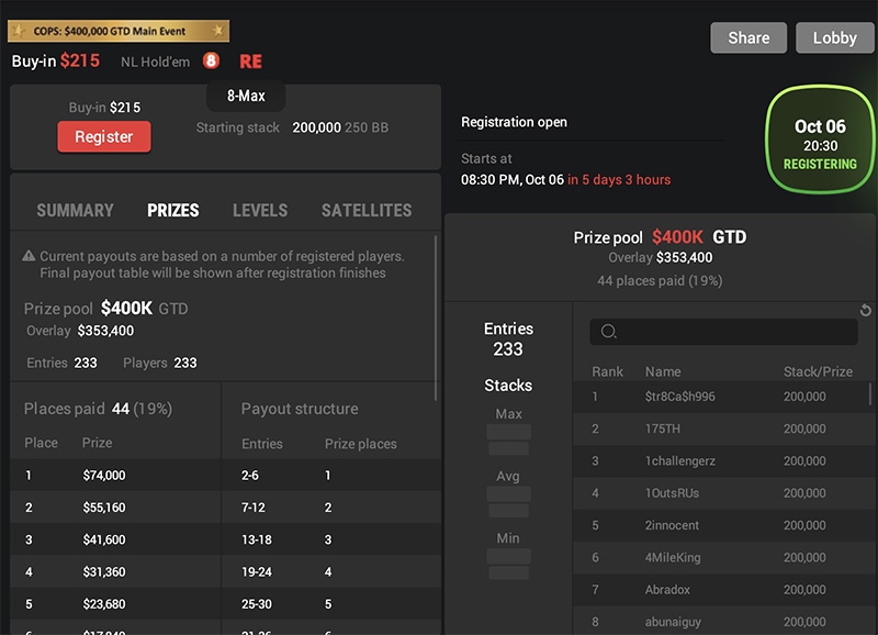 - 6 октября в 20:30 МСК — $215 Main Event $400K GTD