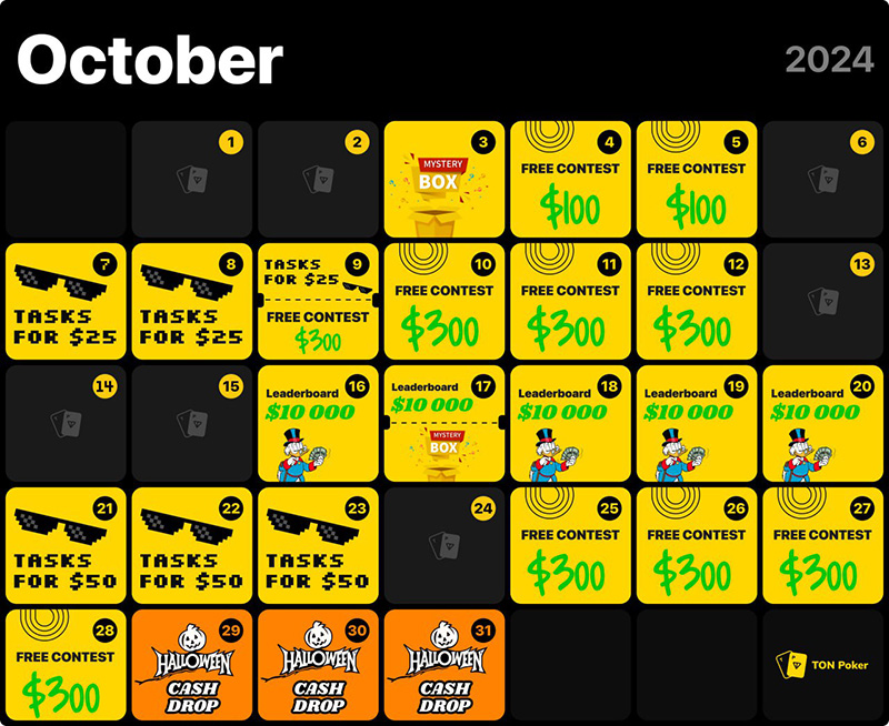 - 28-30 октября — найдите цифровые коды на каналах TON Poker и получите кастомную Хэллоуинскую аватарку