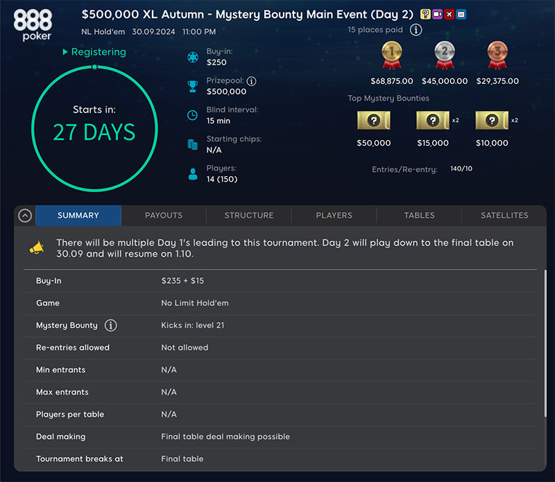 888poker: флайты в $250 XL Autumn Mystery Bounty $500K GTD (недоступно игрокам из РФ)