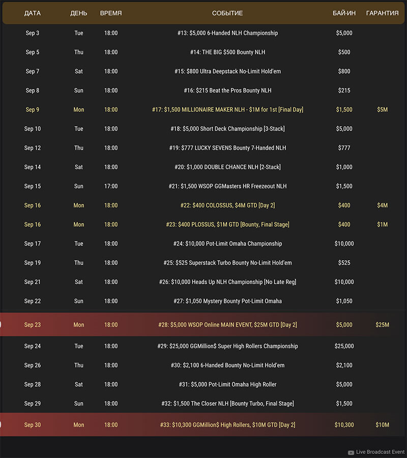 Как всегда, всего будет 6 Main Event: по 3 по Холдему и Омахе. Все они стартуют 29 сентября. В двух мейнах по Холдему гарантии снизили, в двух мейнах по Омахе гарантии увеличили. Гарантии в ещё двух мейнах остались без изменений: