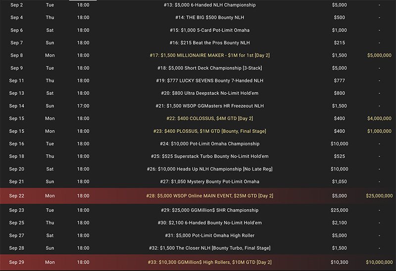 Всего будет 6 Main Event: по 3 по Холдему и Омахе. Все они стартуют 28 сентября. Во всех мейнах гарантии были снижены: