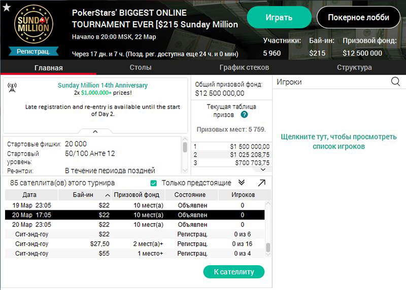 - $22 билет на сателлит — 750.000 из 10.000.000