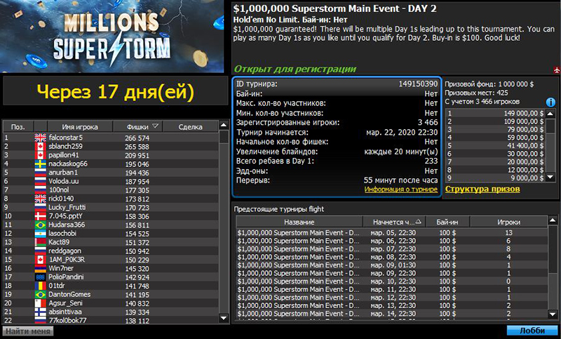 Нестандартный турнир с демократичным по меркам турниров-миллионников бай-ином в $100 ($92+$8) проходит на 888poker. С 1 марта на протяжении 3 недель идут флайты первого дня $1M GTD The Superstorm Main Event. В первый день необходимо отыграть 12 уровней по 20 минут. Игроки со своими стеками после 12 уровня переходят в Day 2, который стартует 22 марта в 22:30 (МСК). Попытаться отобраться в Superstorm Main Event можно через фрироллы, предварительно выполнив простые задания.