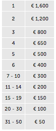 В гонке принимают участие все игроки обеих комнат, а призы распределяются на 50 мест, при этом главный приз составляет €1600.