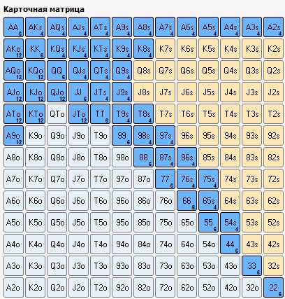 AJs-A2s, K8s+, AJo-A9o, KJo-KTo = 120 рук.