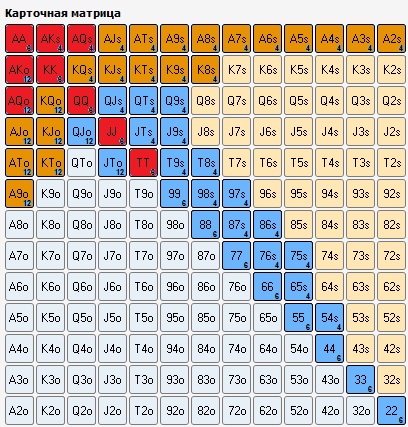 Эти списки сгруппированы так , чтобы легче было запомнить, какие руки могут играться коллом, а какие через блефовый 3бет.