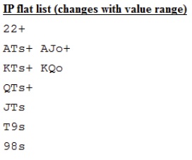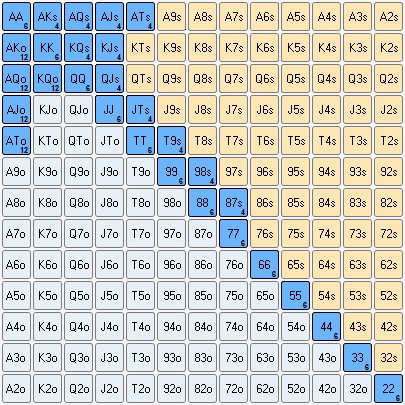 22+, A2s+, K8s+, Q9s+, J9s+, T8s+, 97s+, 86s+, 75s+, 65s, 54s, A9o+, KTo+, QJo, JTo