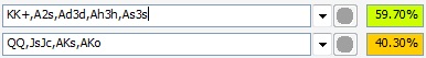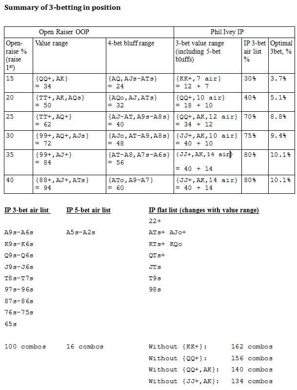 Таким образом Айви будет играть на префлопе 3бет/пуш с КК+ и добавит несколько 5бет-блефовых рук, до тех пор пока наши самые слабые руки не станут обладать 40% эквити.