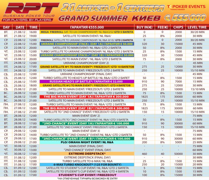 Структура турниров и выплат: Структура турниров на RPT, как обычно, глубокая и сбалансированная, что позволяет играть в настоящий покер, вместе с этим в Киеве будут несколько динамичных турниров. На RPT мы придерживаемся идеи плавного распределения призовых, вместо «рекламных» первых мест и крупных скачков между призовыми местами на финалке.