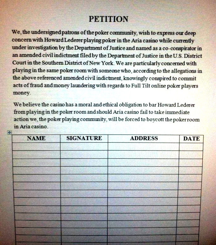 Оффлайн-гриндеры Лас-Вегаса выступили недавно с инициативой забанить Говарда Ледерера в казино Aria. Да, именно так, почти официально. Кашу эту заварил известный регуляр лимитов $5/$10 и $10/$20 Ник ДиВелла, сообщив у себя в твиттере, что решил собрать голоса и подписи в поддержку специальной петиции против того, чтобы Ледерера пускали за столы этого казино. Кстати, странно, что инициатором стал не Даниэль Негреану, так люто ненавидящий Ледерера.