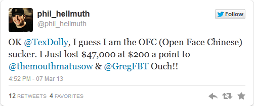 Игра стала популярной совсем недавно и несмотря на то, что ряд профессионалов по Безлимитному Холдему ринулись осваивать новую дисциплину, многие все еще находятся в поисках оптимальной и плюсовой стратегии. В том числе и Фил Хельмут, который на днях признался в твиттере, что он просто фиш в китайский покер: