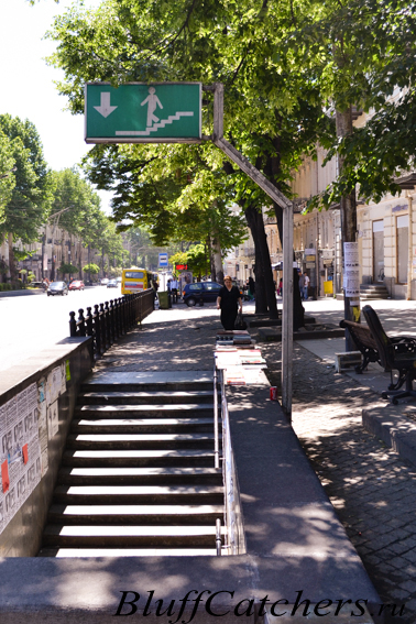 Пешеходы в Тбилиси не предусмотрены. Регулируемые и нерегулируемые пешеходные переходы встречаются редко. Если же встретите подземный переход, который не выглядит как вход в метро, лучше туда не спускайтесь. Они используются как общественные туалеты. Люди там не ходят, что неудивительно, ведь невозможно бежать, затаив дыхание и закрыв глаза. Но есть и пара нормальных переходов, по наблюдениям, у таких, человечек на табличке идет по лестнице на зеленом фоне.