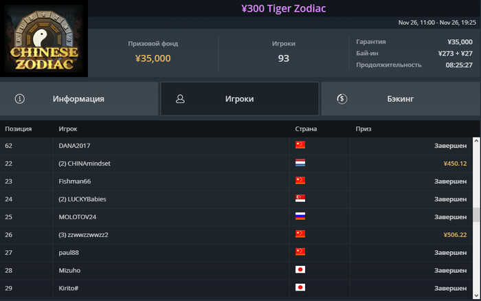 - В турнире участвовало 93 человека, но по данным системы, 22 из них зарегистрировались во время неполадок, поэтому им просто вернули бай-ин. Остальные 71 сформировали призовой фонд ¥19,383 (71x273)