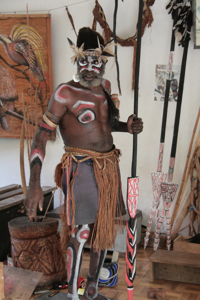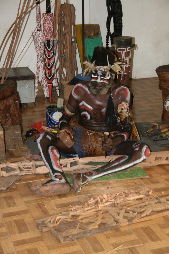 Например, на участке острова Папуа живет этот парень, который целыми днями создает шедевры местной культуры: вырезает фигурки из дерева, делает луки, копья и барабаны.