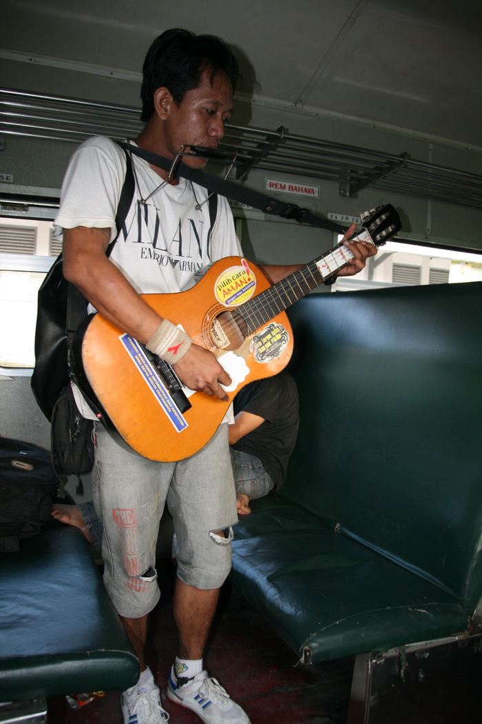 По опыту передвижения а индийских поездах я знал, что в определенный момент все это должно закончится. Около одиннадцати вечера все торговцы угомоняться, инвалиды исчезнут, а пассажира лягут спать. И в очередной раз я ошибся. Броуновское движение в индонезийской электричке продолжалось всю ночь напролет. А к утру, когда, наконец, основная масса людей - как полноценных, так и не очень - схлынула, по вагонам пошли музыканты! Эти ребята, видимо, тоже работают круглые сутки. Иначе, я не знаю каким образом они начали появляются в вагоне с пяти утра. Апофеозом всего происходящего стал (стала?) огромный трансвестит, появившийся в вагоне около шести и с бубном! Разрыв сознания под названием "Танцы с бубном вокруг белого человека" продолжался несколько минут. Причем, пошлости танцевальных па этого существа могли бы позавидовать даже бывалые танцовщицы баров для дальнобойщиков Транссибирской магистрали.