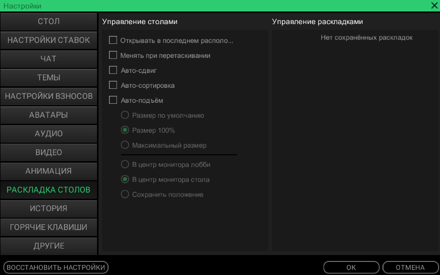 Также в разделе «Стол» можно задать выделение активного стола, активацию окна при наступлении вашего хода и под курсором.