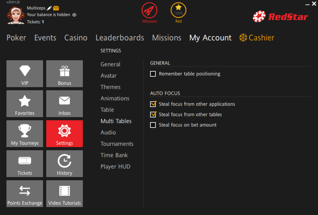В настройках рума есть специальный раздел «Multi Tables», в котором можно зафиксировать сохранение расстановки столов по экрану и задать автофокус на активные столы RedStar Poker, в том числе со смещением внимания с окон других приложений на устройстве.