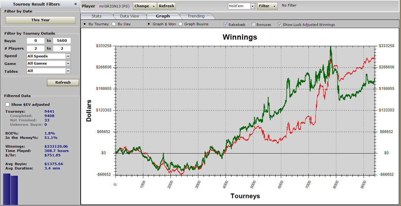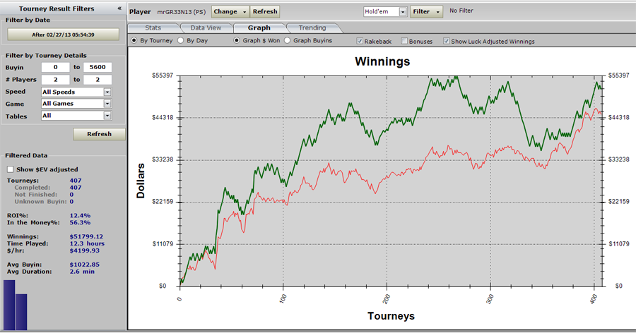 На старзах Дэниэл использует псевдоним mrgr33n13, и riyyc225 на FTP. В основном играет хэдз-ап снг, турбо и гиперы. Его конечная цель - получение 5 млн VPP и 1.25 млн профита на sharkscope (на данный момент он имеет 600,000). И пока что всё для него выглядит очень радужно. Вот, например, его впечатляющий график профита на момент открытия своей темы (27 февраля) на 2х2: