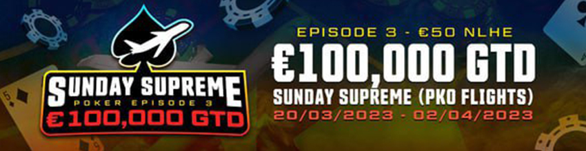 Episode 3 - Sunday Supreme рум запустил следом — с 20 марта по 2 апреля. Это была уже не мини-серия, а один крупный мультифлайт €50 Sunday Supreme €100K Gtd.