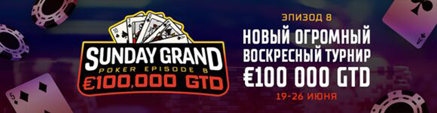 Episode 8: Sunday Grand вновь представлял собой один турнир-мультифлайт — €125 Sunday Grand €100K Gtd, но в отличие от предыдущих он прошёл одним днём — с 25 на 26 июня.