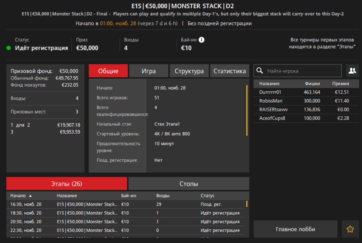 Он проходит с 20 по 27 ноября как единственный мультифлайт €10 Monster Stack €50K Gtd.